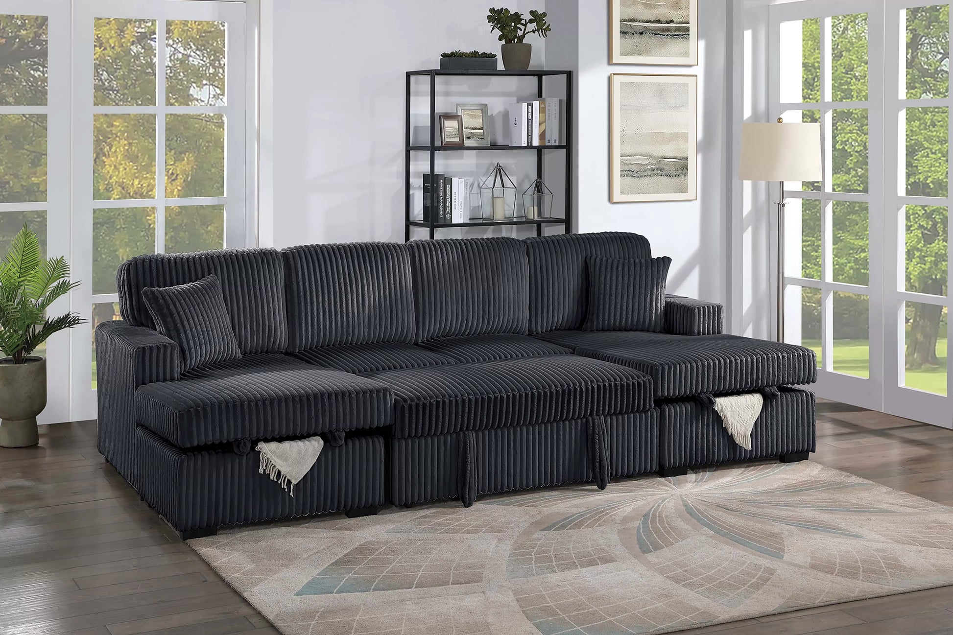 This stylish and practical piece combines comfort, storage, and versatility in one sleek design. Upholstered in soft Fur-Like corduroy, the sectional offers a cozy texture that’s perfect for lounging. It comfortably seats up to four people, making it ideal for family gatherings or relaxing with friends. The sectional features two spacious storage areas, conveniently located under the seats of both the RAF (Right Arm Facing) Chaise and LAF (Left Arm Facing) Chaise, providing the perfect spot to stow away blankets, pillows, or other living room essentials. When extra sleeping space is needed, the middle section easily pulls out, transforming the sectional into a bed for overnight guests. Adding to comfort and style are two matching accent pillows that complement the overall design, while the low-profile legs provide a modern, grounded look that seamlessly fits into any room layout. Whether you're hosting or just enjoying a quiet night in, this sectional offers functionality without compromising on style.