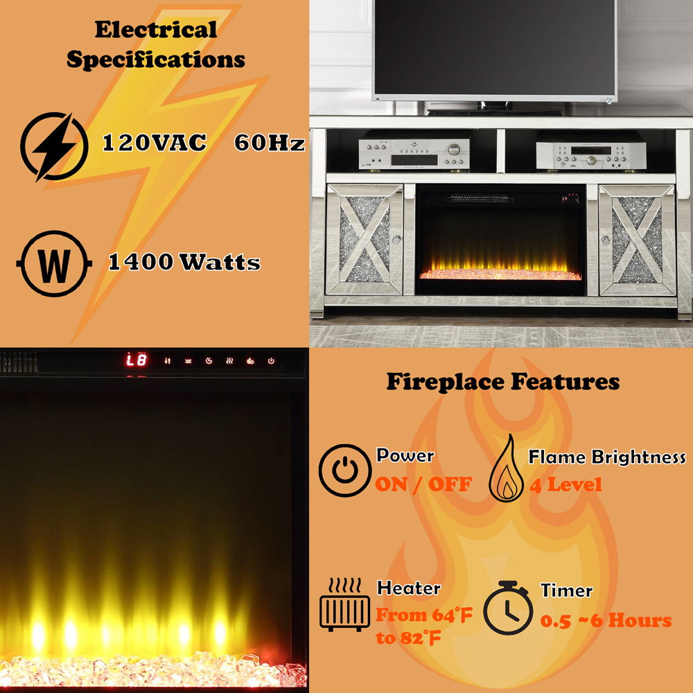 Brighten up your living space with the Noralie TV stand with a fireplace. In an alluring mirrored and faux diamond finish to showcase your glamourous side. The media shelf has cable management cutouts to keep cables out of sight to preserve the beautiful look of the piece. The touch panel LED fireplace features adjustable temperature control and a timer function.