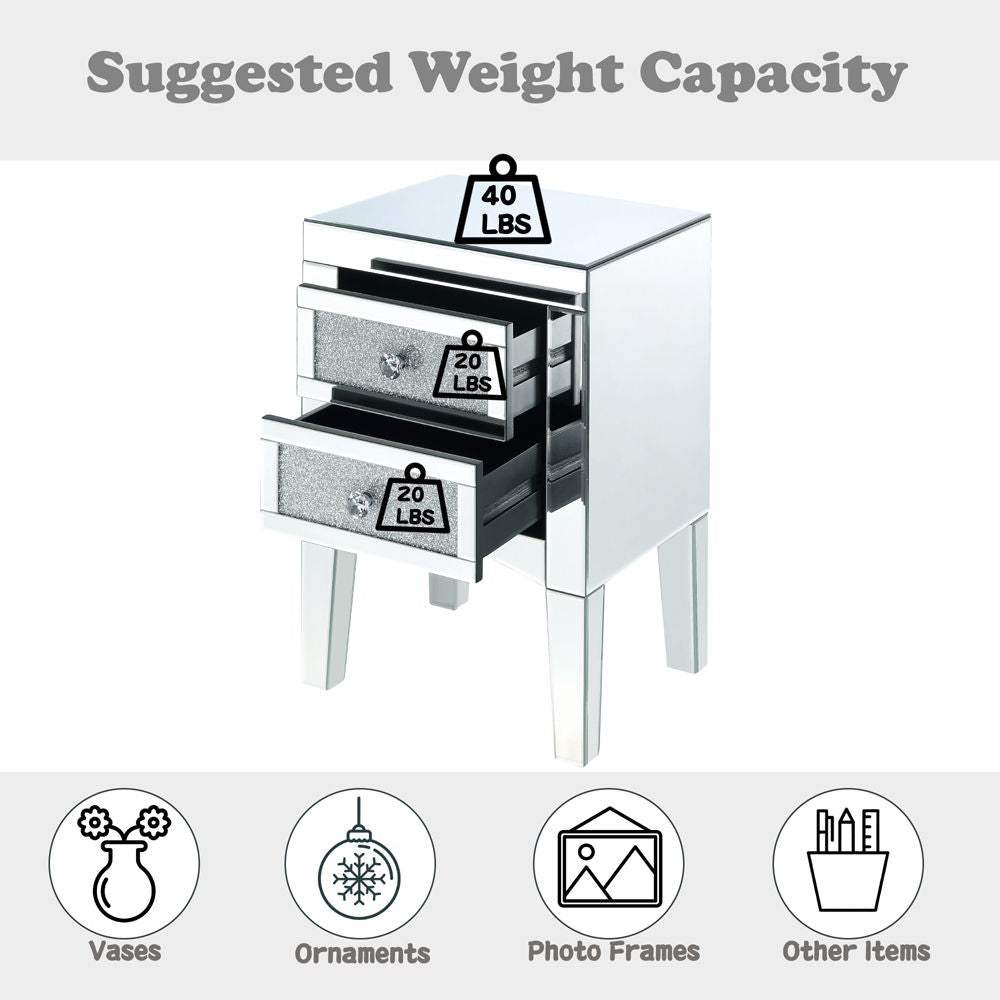 - Features: Mirrored Finish, Front Drawer w/w/Faux Crystals & Clear Glass, Mirrored Tapered Leg (Open Base)